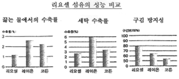 이 리요셀 섬유의 용도는 남녀 내의에서부터 외의는 물론 홈 인테리어에 이르기 까지 그 용도가 널리 확산되고 있다. 리요셀 섬유와 비스코스 레이온 제품의 성능을 도표로 표시해 보면 그림과 같다.