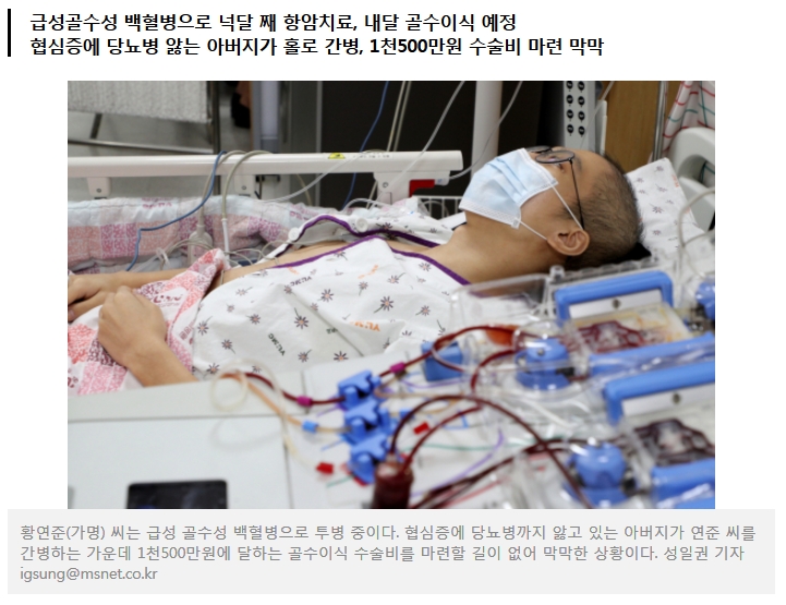 백혈병을 앓는 아들의 곁은 아버지 황기호(가명·56) 씨가 홀로 지키고 있다.