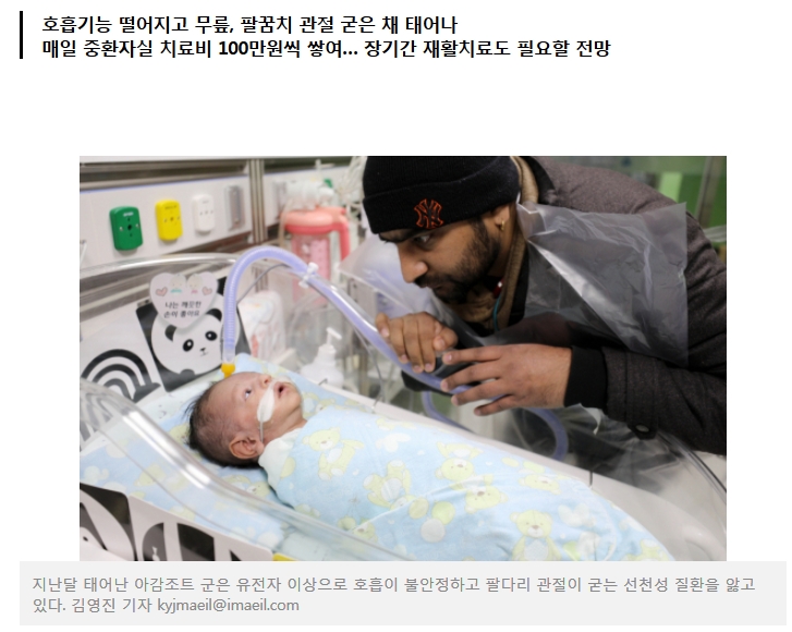 인도에서 온 파라미트(31) 씨가 걱정스러운 얼굴로 아이의 얼굴을 살폈다. 태어난 지 한 달도 되지 않은 아감조트 군은 줄곧 신생아 중환자실에만 머물고 있다. 호흡이 불안정한 데다 팔꿈치와 무릎 관절이 뻣뻣하게 굳는 등 복합적인 이상 증상을 안고 태어난 탓이다. 아이는 코에 삽입한 고압산소호흡기에 의지해 가쁜 숨을 내쉬고 있었다.