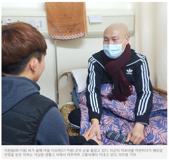 비용을 감당하지 못해 치료를 중단한 그는 현재 허리가 끊어지는 췌장암의 고통을 그냥 몸으로 버틸뿐이다. 그래도 두 아들의 아버지인 이씨는 삶에 대한 희망을 놓지 못한다.