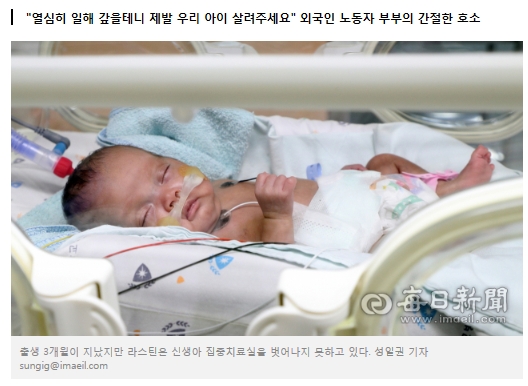 문제는 병원비다. 라스틴이 하루 사용하는 인큐베이터 입원비는 200만원이 넘는다. 벌써 3달을 있었으니 그 비용만 따져도 1억8천만원이 넘는다. 부모가 불법체류 외국인이라 건강보험 적용이 불가능한 탓이다.