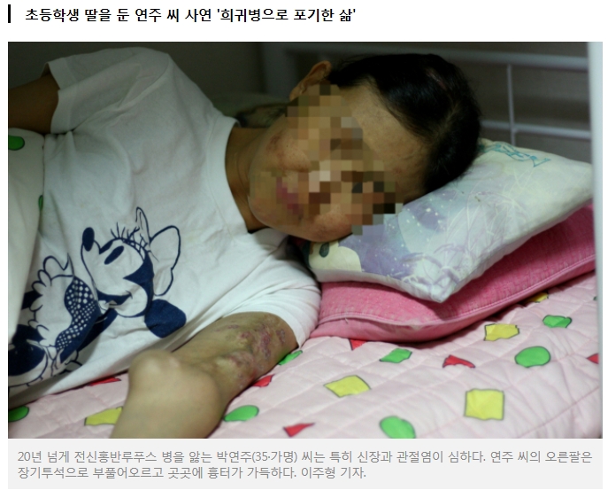 이 병은 면역세포가 오히려 자기 몸을 공격하면서 피부, 관절, 혈액, 신장 등 신체의 다양한 기관을 침범하는 자가 면역질환이다. 아직 정확한 원인도 완치방법도 없는 희귀질환으로, 연주 씨는 특히 관절염과 피부발진 신부전증을 다년 간 앓고 있다.