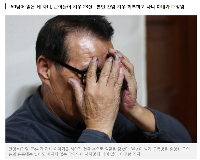 부인이 항암치료 중인 가운데 최근에는 지적장애를 앓고 있는 둘째 아들마저 만성 담낭염으로 앓아누웠다. 안 씨는 구둣방 일은커녕 매일 병원으로 출퇴근하기 바쁘다.