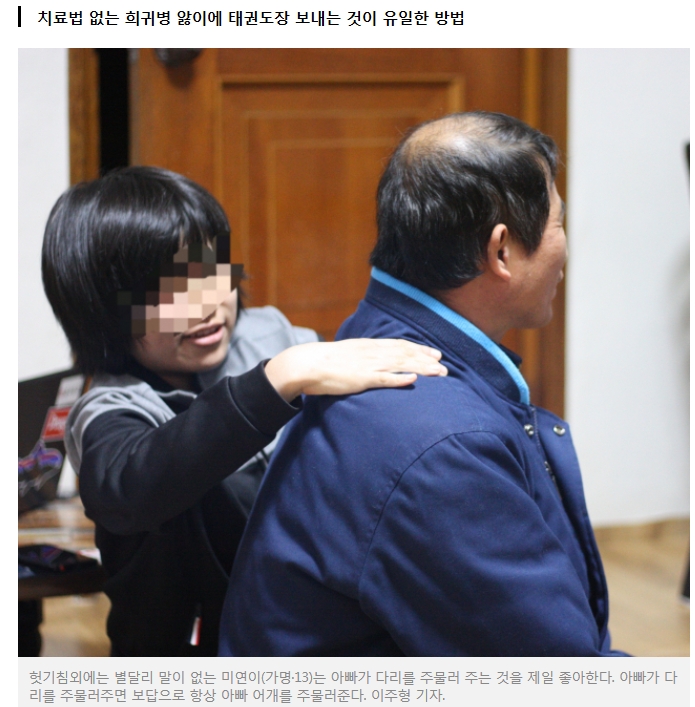 워낙 손 쓸 도리가 없는 병이다보니 몇 년 전 병원에서 "태권도라도 해보라"고 권해 도장을 다니기 시작했는데, 그나마 미연이의 유일한 낙이 됐다. 다만 비용이 부담이다. 재익 씨는 "저렇게 좋아하는데 태권도장 수련회 가는 것조차 억지로 막아야 하는 형편"며 "아프게 태어나게 한 것도 미안한데, 경제적으로까지 힘들게 해 너무 맘이 아프다"고 눈시울을 붉혔다.