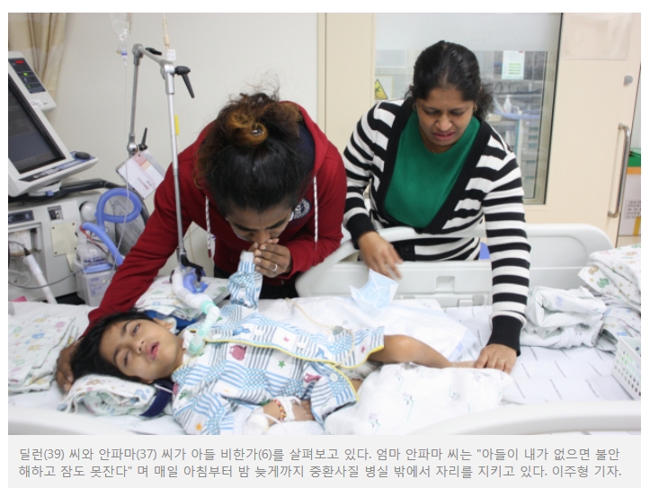 12시간이 넘는 공장 야간작업 마친 아빠 딜런(39·스리랑카) 씨는 1시간을 운전해 비한가(6)를 보러 온다. 그는 걷지 못하는 아들의 병원비와 생활비를 충당하려고 4시간 밖에 잠을 자지 못한 채 일과 간호에 매달리고 있다.
