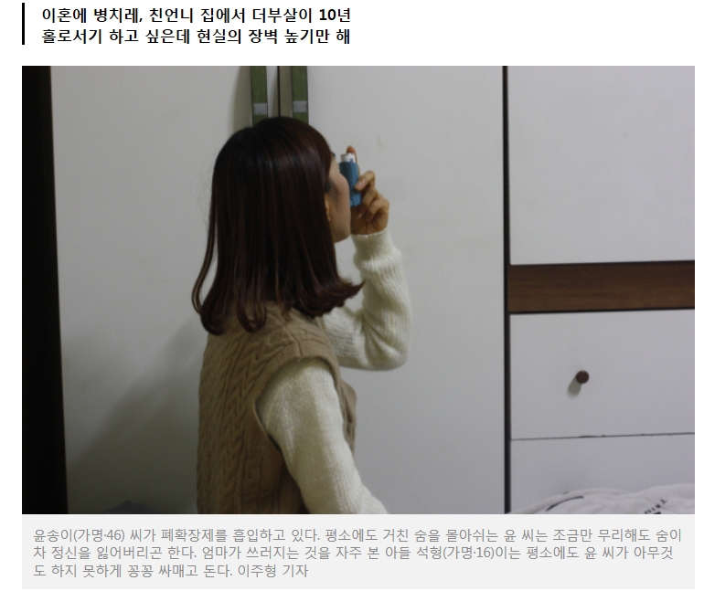 윤씨는 2002년쯤 아르바이트를 하던 식당에서 전 남편(43)을 만났다. 1년 뒤 아들 석형이(가명·16)를 가지게 됐고 어려운 형편에 월세 방에서 결혼을 하고 살림을 차렸다. 행복도 잠시, 윤씨의 폐 상태는 아들을 출산하고부터 더욱 나빠졌다. 폐에 생긴 곰팡이(국균종)가 너무 퍼져 매일같이 피를 토했다.
