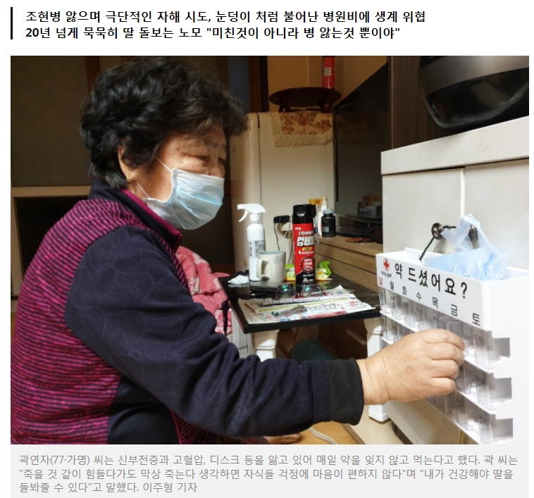 수개월째 병원에 있는 딸 앞으로 이미 자부담 병원비만 600만 원이 넘는 상황이다. 지금도 간병비로만 매일 11만원이 든다. 기초생활수급금과 노령연금 등을 합쳐도 월 생활비는 90만원이 채 되지 않는다.