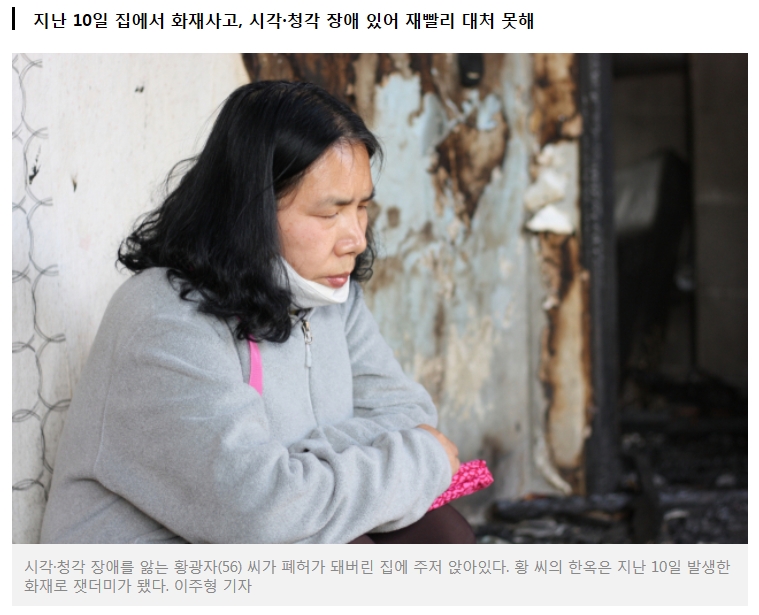 지난 10일 오전 10시30분, 비가 내렸다. 남편도 그날은 일이 없어 방에서 선잠이 들었다. 어디선가 매캐한 냄새가 난다 싶어 방 밖으로 나왔지만 눈과 귀가 모두 침침한 황 씨는 화재를 재빨리 알아차리지 못했다. 부부는 다용도실 전선에서 시작된 불이 화장실과 대문을 다 태울 무렵 간신히 몸만 빠져나올 수 있었다. 황 씨는 "남편이 대문에 불이 붙었다고 소리쳤다"며 "담을 타 넘다 넘어져 온몸이 긁히고 타박상이 생겼다"고 회상했다.