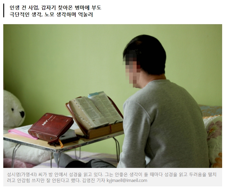왼쪽 고관절을 절단한 그는 불편한 다리로 다시 일어서보려 안간힘을 썼지만 역부족이다. 2018년부터 구청 일자리 사업, 보청기 영업 일을 전전하다 결국 지난해 1월 파산 선고를 받았다. 무기력함은 우울증으로 또 극단적인 생각으로 꼬리에 꼬리를 물었다. 매일 성경을 붙잡고 절규해보지만, 도무지 나아지지 않는다.