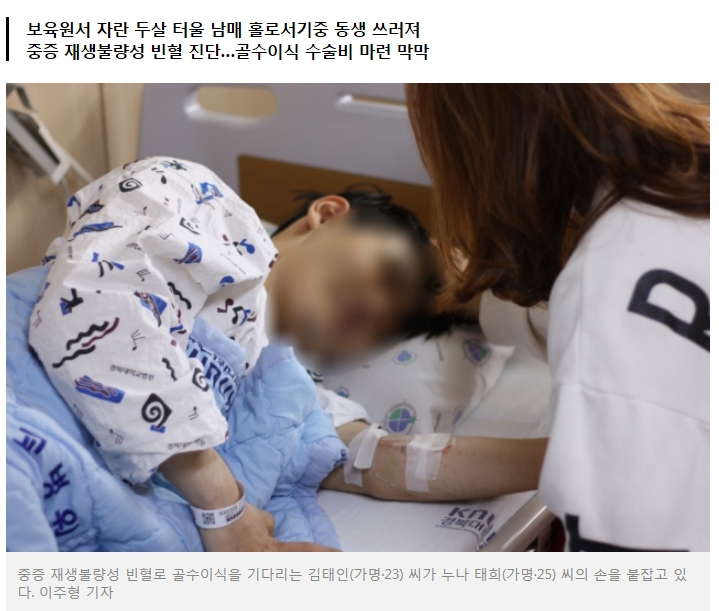 당시 서울의 한 음식점에서 일하던 태희 씨는 동생의 연락을 받자마자 두 달 동안 서울과 대구를 오가며 간호를 도맡았다. 그러나 태인 씨가 자꾸 쓰러지는 탓에 지난 2월부터는 계속해서 동생 곁을 지키고 있다. 그는 골수기증을 자처했지만 적합성 검사에서 불일치 판정을 받았다. 간절한 기도가 통했을까. 기적처럼 기증자가 나타났다.
