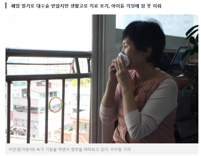 이민영(가명·50) 씨는 거실 창가 옆에서 가쁜 숨을 몰아쉬는 것 말고는 할 수 있는 게 없다. 어깻죽지를 다 잘라내고, 갈빗대를 부러트려야 할 만큼 혹독한 암 수술을 받고서도 생계난으로 치료를 이어나갈 수 없어서다. 치매에 걸린 노모와 남편(56), 다섯 아이까지 여덟 식구가 살아가는 25평 남짓한 전세집에는 이 씨가 몸을 누일 공간마저 여의치 않았다. 그는 "치료약이 하나밖에 없는데 비보험이라 어려운 형편에 도저히 엄두가 안 난다"라며 "아직 애들이 너무 어린데 자꾸 불안한 마음만 든다"고 했다.