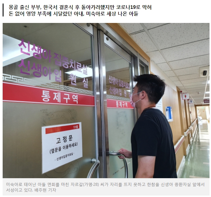 지난 21일 대구 중구 삼덕동 경북대병원 신생아 중환자실. 아들 면회를 끝낸 몽골 출신 자르갈(가명·28) 씨는 한동안 중환자실 문 앞을 서성였다. 안간힘을 써 든 까치발에는 한 번이라도 더 아이를 보고자하는 간절함이 배어있는 듯했다.