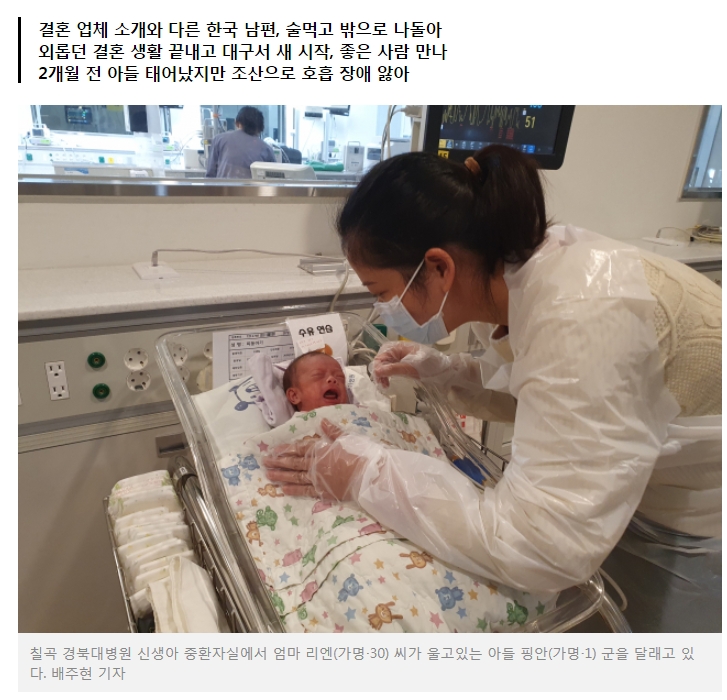 어린 생명이 살기 위해 발버둥 치는 칠곡 경북대병원 신생아 중환자실. 온몸에 기계를 잔뜩 단 신생아들 사이로 한 아이의 거친 울음소리가 들려왔다. 아이의 입에선 흰색 거품이 연거푸 쏟아져 나왔다. 아이의 구토를 닦아내는 간호사 옆으로 엄마 리엔(가명‧30) 씨가 발을 동동 구르던 중이었다. 엄마는 아이의 배를 쓰다듬어 보지만 울음은 좀처럼 그칠 줄 몰랐다. 10여 분이 지났을까. 리엔 씨의 이마에 한 방울의 땀이 흘러내렸다. 어미의 애타는 마음이 가득 서린 땀방울이었다.