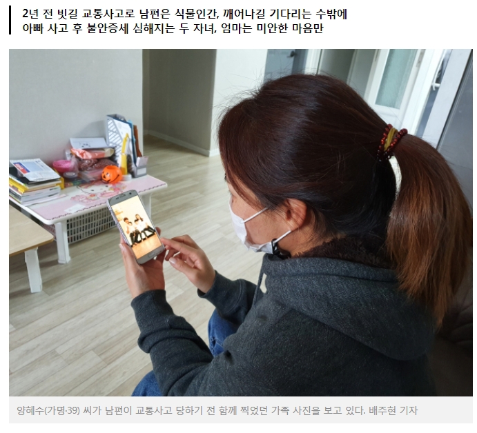 병명은 '내상성 뇌손상'이랬다. 뇌가 손상됐지만, 출혈이 없어 손쓸 방법이 없다고 했다. 남편이 기적처럼 깨어나길 기다리는 수밖에 없었다. 하지만 남편은 2년째 눈을 감고 있다.