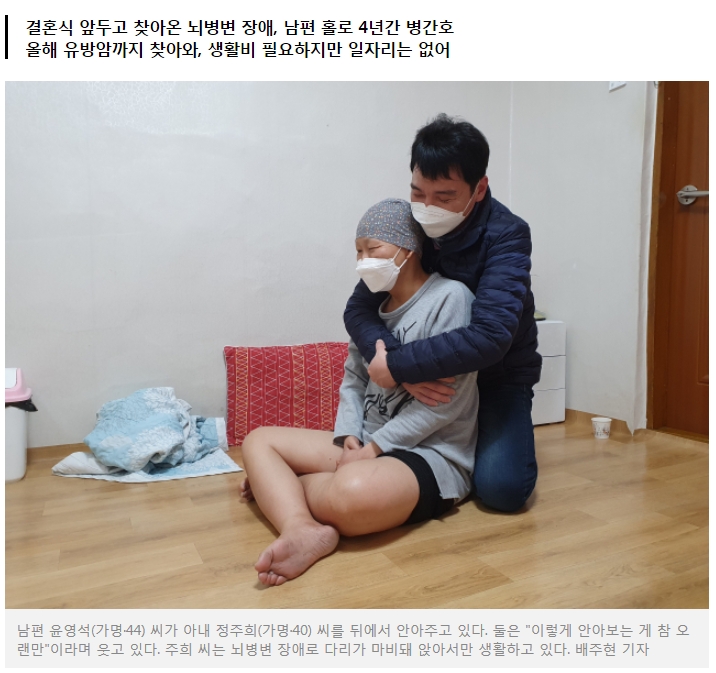 결혼식을 3개월 앞둔 어느 날 밤이었다. 주희 씨는 남편을 급히 흔들어 깨웠다. 몸이 뜨거웠고 숨을 제대로 쉴 수 없었다. 의사는 뇌에 이상이 생겼다고 했다. 몸 상태가 너무 악화돼 며칠이 지나서야 받은 머리 수술. 그날 이후 주희 씨는 뇌병변 장애 진단을 받았다.