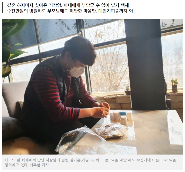 11일 오전 3시 텅텅 비어 있는 대구의 어느 한 신혼집. 안방에서 들려오는 한 남성의 끙끙 앓는 소리가 집의 빈 공간을 가득 채운다. 침대에 몸을 뉜 김기훈(가명·34) 씨는 쉽게 잠에 들지 못하고 몸을 이리저리 뒤척인다. 아랫배에서 올라오는 묵직한 통증은 좀처럼 가라앉지 않는다. 몸이 덜덜 떨리고 식은땀은 줄줄 흘러내린다. 그는 직장암 3기 말이다. 동이 트고 나서야 기훈 씨는 겨우 잠에 들었다.