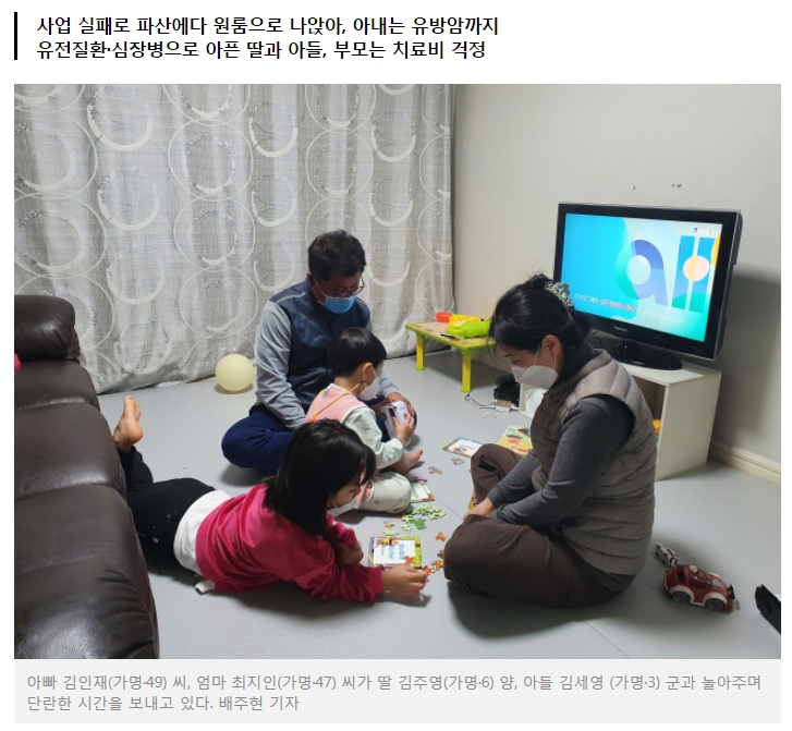그러던 지난해 아내 지인 씨에게 유방암이 찾아왔다. 다행히 상태가 심하지 않아 올 1월 수술도 무사히 마쳤지만 치료 탓에 지인 씨는 당분간 경제활동이 어렵게 됐다.