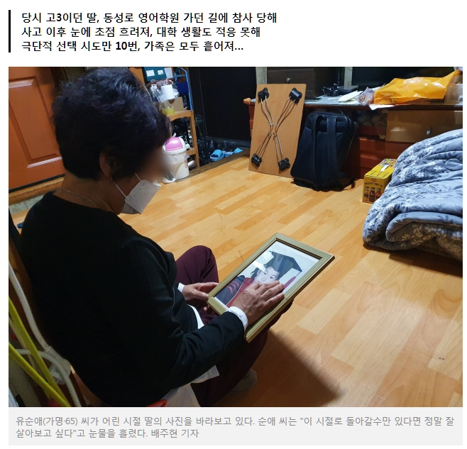사고 이후 딸의 눈은 초점을 잃어갔다. 혼잣말을 하거나 멍하니 있기를 반복했다. 학교생활 내내 반장을 놓치지 않았던 터라 억지로 학교에 나갔지만 도통 적응을 못 한다는 담임선생님의 말만 돌아왔다. 그렇게 딸은 제대로 치료를 못 한 채 떠밀리듯 졸업했고 경주의 한 전문대에 입학했다.