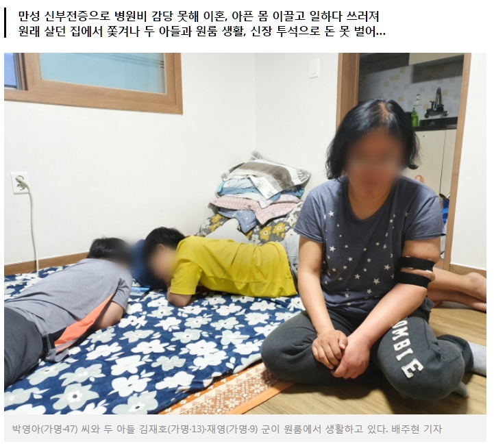 두 아들 재호(가명·13)·재영(가명·9) 군과 남은 영아 씨. 아픈 몸을 이끌고 악착같이 공장을 다녔다. 하지만 영아 씨는 방치해 둔 병으로 결국 쓰러졌다. 급히 투석 혈관 수술을 받은 그는 이제 일주일에 세 번씩 신장 투석을 받아야 할 처지가 됐다.