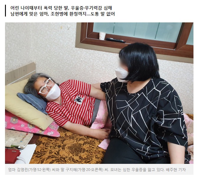 지혜 씨의 옆방엔 엄마 김영린(가명·52) 씨가 침대 위에 누워있다. 침대에서 좀처럼 몸을 일으키지 못한 채 계속 손을 떨던 그 역시 마음의 병이 깊다. 결혼 전에는 버젓이 회사 생활도 잘했던 영린 씨였지만 결혼과 동시에 삶은 180도로 달라졌다. 지혜 씨를 가졌을 때도 남편의 폭력은 지속됐고 딸이 태어나도 머리를 숱하게 맞았다. 그 뒤로 모든 게 무섭고 두렵고 몸이 떨리기 시작하더니 환청이 들리기 시작했다.