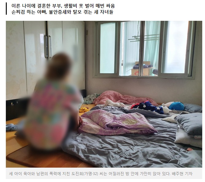 남편은 그때부터 공사장 등 일용직에 나섰다. 첫째 딸 재영(가명·12)에 이어 둘째 재호, 셋째 재희(가명·8)가 줄줄이 태어나면서 생활비도 두 세배씩 들어가기 시작했다. 진희 씨는 세 아이를 돌봐 생활비를 버는 것은 온전히 남편 몫이었다. 늘 부족한 생활이었지만 그래도 어떻게든 꾸역꾸역 살아가고 있다고 생각했다. 하지만 점차 남편은 일을 나가는 날을 줄였고 그때부터 서서히 갈등은 시작됐다.