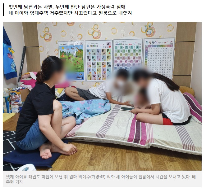 박 씨와 네 명의 아이가 사는 곳은 원룸. 박 씨는 1~2년마다 이사를 해야 하는 신세에 아이들에게 미안한 마음이 크다. 올 3월 겨우 임대 주택에 들어갔지만 아이들이 시끄럽다는 이유로 집주인에게 보증금을 받지 못하고 쫓겨나 앉은 곳이 원룸이다.