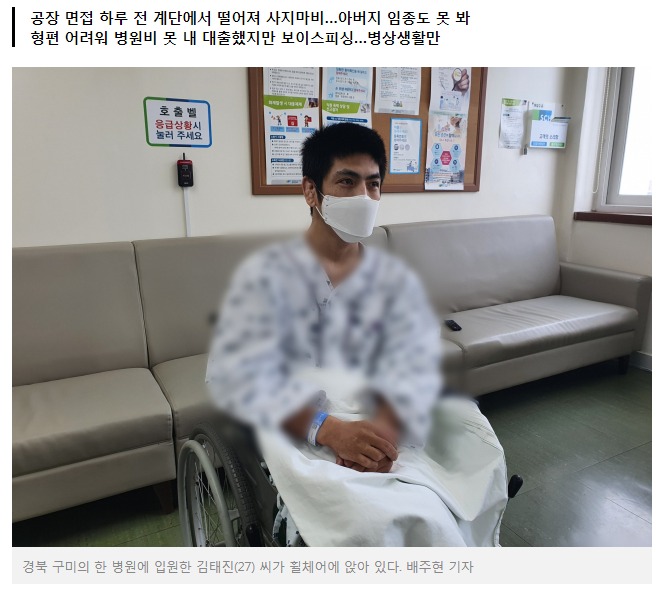 경북 구미의 한 병원 침상에 누운 김태진(27) 씨의 휴대전화 벨소리가 울린다. 간호사의 도움으로 겨우 받은 전화기 너머 큰 형의 흐느낌이 전해진다. 가슴이 쿵 하고 내려앉는다. 아버지의 사망 소식이었다.