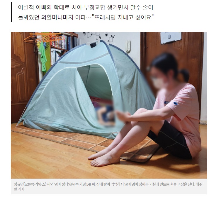그렇게 가정이 깨지고 양씨와 여동생 엄마는 외할머니네로 들어왔다. 하지만 불행이 자꾸 겹쳤다. 가정폭력의 후유증 때문일까. 엄마는 불면증에다 식도의 정맥이 막히는 식도 정맥류, 간이 굳어버리는 간 섬유화까지 시달렸다. 몸은 일상생활이 힘들 정도로 망가져 정 씨는 누워서만 생활해야 했다. 딸들을 위해 돈을 벌 수 없었고 우울증까지 정씨를 덮쳤다.
