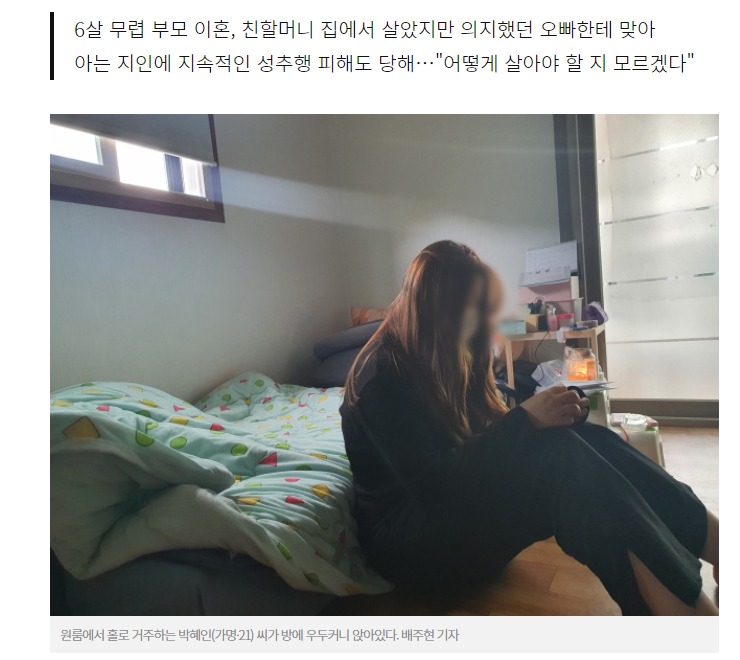그런 박 씨에게 처음으로 도움을 준 어른은 아르바이트 사장이었다. 집에서 할 수 있는 부업으로 돈을 벌어가던 박 씨는 사장을 알게 됐고, 박 씨의 형편을 눈치 챈 그는 본인이 계약해둔 한 원룸에 박 씨가 거주할 수 있도록 도와줬다. 그 무렵 용기 내 몇 년을 참고 참았던 피해 사실을 가족들에게 알려 신고를 하게 됐다.