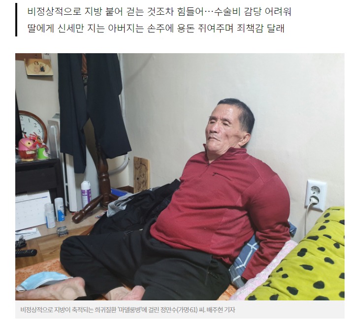문제는 치료였다. 지방을 떼어내는 게 유일한 치료법이었지만 상체 모든 곳에 지방이 축적된 탓에 한 부위의 수술만으로도 치료비 300만원이 넘게 나간다. 하지만 기초생활수급자인 아버지는 돈이 없다.