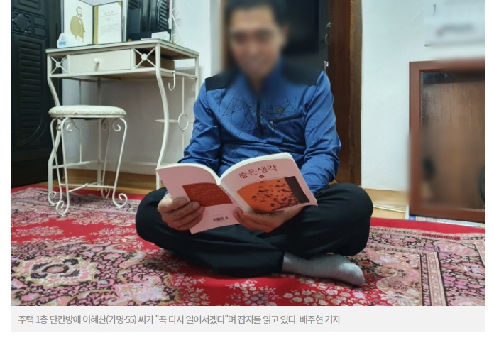 그가 유일하게 기댈 곳은 좋은 글귀를 담은 책뿐. 거실에 수북하게 쌓인 책을 읽고 또 읽으며 '살 수 있다'는 희망을 되새기고 있다. 없는 형편이지만 사회복지기관에 기부를 하며 오히려 남을 돕는 이 씨. 거친 손을 가진 그에게서 따뜻함과 단단함이 느껴졌다.
