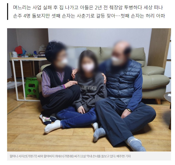 서 씨에겐 딸도 있지만 결혼 후 미국으로 이민 간 뒤 소식이 끊겼다. 딸이 죽었는지 살았는지도 알 길이 없다. 서 씨는 "젊었을 때도 늘 고생만 했는데 아직까지 이러고 있다"며 자신의 팔자가 사납다고 했다. 유일한 희망은 손주뿐이지만 도대체 어떻게 해야 손주를 잘 키우는 건지 모르겠다. 그런 서 씨는 굽은 허리로 말없이 곁에 앉아 있는 막내 손녀의 머리만 하염없이 쓰다듬었다.